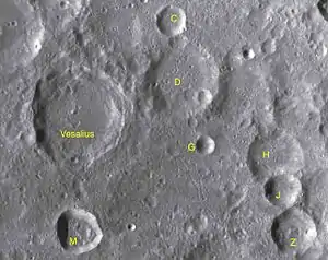 - Образование сателлитного кратера Везалий M относится к позднеимбрийскому периоду[1].