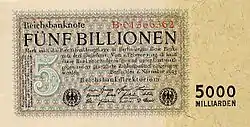 В декабре 1922 года килограмм хлеба стоил около 130 марок, а годом позже — свыше 300 миллиардов. В июле 1923 года золотая марка стоила 262 тысячи бумажных марок, а в ноябре — уже 100 миллиардов. Таким образом, за четыре месяца цена бумажной марки упала в 382.000 раз[4]. На 3 сентября 1923 года обменный курс доллара США составлял почти 10 млн марок, а в конце месяца — уже 160 млн марок. Однако восстановление золотого стандарта 30 августа 1924 года(отменённого в начале Первой мировой войны) положили конец инфляции, одновременно была проведена деноминация (1 рентная марка или рейхсмарка = 1 млрд бумажных марок; 1 доллар США = 4,20 рентных марки).