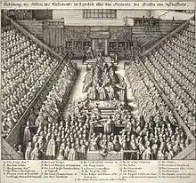 Вейн сформировал союз с группой военных-республиканцев, известных как партия Уоллингфордского дома, которые тайно встречались, в нарушение законов, ограничивающих военное участие в политических вопросах[119]. Кромвельские фракции в парламенте не смогли добиться перевеса в парламенте, и Кромвель был вынужден распустить парламент в апреле 1659 года[120]. Но уже через несколько дней лишенный поддержки армии Кромвель отрекся от должности[121].