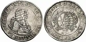 | Аверс | Курфюрст Саксонии Иоганн Георг II. Круговая надпись "IOHAN(nes). GEORG(ius). II. D(ei). G(ratia). DUX. SAX(oniae). I(uliaci). CL(iviae). ET. MONT(ium)" (Иоганн Георг II Божьей милостью герцог Саксонии, Юлих-Клеве-Берга) | |