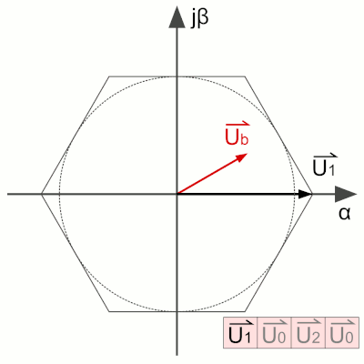 Базовые векторы для коммутации типичного трёхфазного моста при векторной ШИМ (см. рисунок справа)