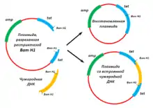 Предположим, что в плазмиду необходимо встроить фрагмент, который ранее был вырезан из другой ДНК рестриктазой Bam HI (то есть он имеет на концах последовательность нуклеотидов, характерную для сайта рестрикции Bam HI). Для этого плазмиды обрабатываются рестриктазой BamHI, (которая разрежет кольцевую молекулу в сайте рестрикции и образует линейный участок ДНК) и добавляются участки чужеродной ДНК. Поскольку на концах всех фрагментов ДНК находятся комплементарные последовательности нуклеотидов, они начнут «склеиваться», причём возможны два варианта склейки (рис. 2) :