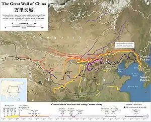 Вели́кая Кита́йская стена́ (кит. трад. 長城, упр. 长城, пиньинь Chángchéng, буквально: «Длинная стена» или кит. трад. 萬里長城, упр. 万里长城, пиньинь Wànlǐ Chángchéng, буквально: «Длинная стена в 10 000 ли») — разделительная стена длиной почти 9000 км (полная длина — 21,2 тыс. км), построенная в древнем Китае и являющаяся крупнейшим памятником архитектуры. В китайском языке слово, обозначающее сам проект (长城, Chángchéng), приобрело также образное значение «несгибаемая могущественная сила, непреодолимый барьер»[3]. Великая Китайская стена упоминается в Государственном гимне КНР.
