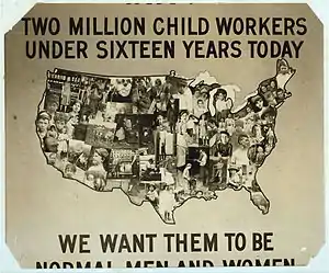 Использование детского труда постепенно сокращалось: в то время как в 1890 году работал почти каждый пятый ребёнок в возрасте от 10 до 15 лет, в 1930 году трудился только 1 подросток из 20. Верховный суд неоднократно становился преградой на пути федерального правительства, пытавшегося ввести полный запрет на детский труд в стране. В 1920-х годах впервые почти половина учеников старшего школьного возраста осталась в школе для продолжения образования: с 1900 года наблюдалось восьмикратное увеличение числа учащихся в старших классах — что было «свидетельством самого успешного конкретного усилия, которое когда-либо предпринимало правительство США»[19].