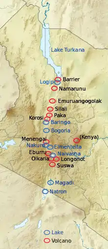 На территории Кении расположены до 64 (9.50 %) от общего числа озёр африканского континента[7]. Восемь из них находятся в кенийской рифтовой долине. С севера на юг находятся следующие озёра: Туркана, Логипи, Баринго, Богория, Накуру, Элментейта, Найваша и Магади[3]. Из всех пресноводными являются лишь Найваша и Баринго[8].