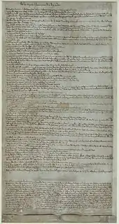 На основе Баронских статей в период с 15 по 19 июня 1215 года был выработан окончательный текст Великой хартии вольностей. Рукопись Хартии дошла до нас в четырёх экземплярах, имеющих на обороте пометку следующего содержания: «Соглашение между королём Иоанном и баронами о предоставлении вольностей церкви и королевству Англии» (лат. Concordia inter regem Johannem et barones pro concessione libertatum ecclesiae et regni Angliae). Текст документа не разделён на пункты, его разбивку на 63 статьи произвели позднейшие издатели. Название «Великая хартия вольностей» также было дано позже по аналогии с предшествующими хартиями и в силу обширных размеров документа[51][52].