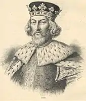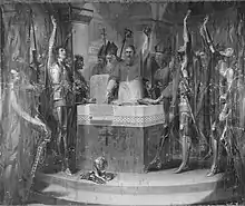 | Иллюстрация из «Истории Англии» Дж. Кэссела | Рисунок М. Кронхайма | Фреска Э. Норманда | Раскрашенная гравюра начала XIX века | Гравюра Э. Эванса по картине Дж. Дойла |