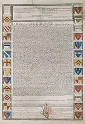 Вели́кая ха́ртия во́льностей (лат. Magna Carta, также Magna Charta Libertatum) — политико-правовой документ, составленный в июне 1215 года на основе требований английской знати к королю Иоанну Безземельному и защищавший ряд юридических прав и привилегий свободного населения средневековой Англии. Состоит из 63 статей, регулировавших вопросы налогов, сборов и феодальных повинностей, судоустройства и судопроизводства, прав английской церкви, городов и купцов, наследственного права и опеки. Ряд статей Хартии содержал правила, целью которых было ограничение королевской власти путём введения в политическую систему страны особых государственных органов — общего совета королевства и комитета двадцати пяти баронов, обладавшего полномочиями предпринимать действия по принуждению короля к восстановлению нарушенных прав; в силу этого данные статьи получили название конституционных.