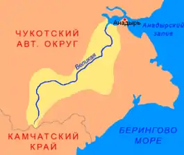 В среднем течении протекает между хребтами Рарыткин и Корякским, в нижнем — по Анадырской низменности, разветвляясь на множество рукавов и мелких водотоков. В устье находятся несколько невысоких островов, которые в весеннее половодье заливаются водой. Питание реки снеговое и дождевое[3].