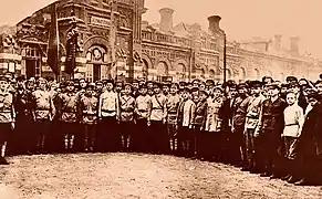У вокзала г. Великие Луки отряд железнодорожников перед отправкой на фронт