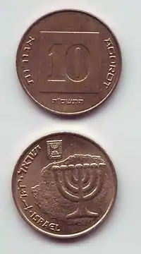Банк Израиля объясняет, что на реверсе указанной монеты изображена древняя монета последнего иудейского царя из династии Хасмонеев, Матитьягу Антигона II, которая была выпущена около 40-37 годов до н. э. во время осады Иерусалима римлянами. На монете изображён семисвечник (менора).