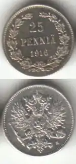 - Серебряными монетами номиналом 25, 50 пенни, 1 и 2 марки с российским двуглавым орлом на реверсе (на монетах номиналом в 1 и 2 марки также и эквивалент в серебре) и номиналом, годом выпуска и дубовыми листьями на аверсе[41].