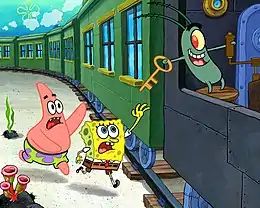 В купе очень тесно. Планктон открывает окно, незаметно забирает ключ у Губки Боба и Патрика и выталкивает их из поезда. Они бегут вслед за ним, но не могут догнать. Тогда они забираются на пригорок, Губка Боб трансформируется в дельтаплан, и они долетают до поезда. Герои начинают преследовать Планктона по всему поезду и добегают до кабины управления. Там он запирает их, отсоединяет вагоны, которые остановились как раз у банка, и направляется за формулой. Тем временем, Губка Боб с Патриком продолжают движение на неуправляемом поезде. Все попытки остановить его оказываются тщетными. Они связываются с диспетчером, но это тоже не даёт результатов. В конце пути находится дом престарелых, и поезд всё-таки останавливается прямо перед ним. Губка Боб и Патрик развернулись обратно и помчались к банку.