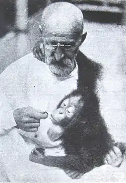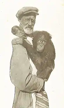![]() М. А. Величковский с орангутаном Фриной. Московский зоопарк, 1928 | |