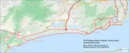 Дистанция олимпийской трассы составила 141 км[1]. Гонка стартовала в форте Копакабана. Дальнейший маршрут прошёл по районам Сан-Конраду, Барра-да-Тижука, пляжам Ипанема, Грумари[2], а также возле памятника Виста Шинеза. Финиш гонки также был расположен на территории форта.