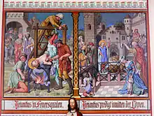 ![]() Св.Венанций подвешен вниз головой над огнём, а затем брошен на растерзание львам. Настенная живопись роспись, храм св.Венанция, Хоргенцелль. | |