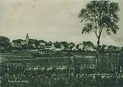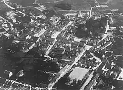 Alte Fliegeraufnahme der Angerburger Altstadt, vorne rechts der Neue Markt, hinten rechts der mit Linden umstandene Kirchberg