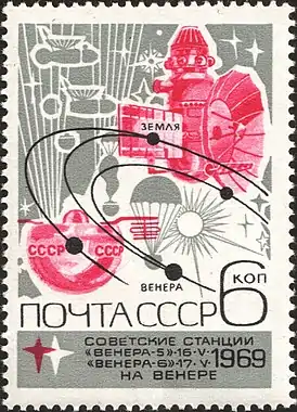 ![]() Почтовая марка СССР. 1969. «Венера-5», «Венера-6» | |