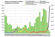 В 2014 экономика страны пережила очередной удар: резкое падение мировых цен на нефть. В результате доходы правительства от экспорта нефти сократились на треть по сравнению с предыдущим годом[26][прим. 1]. Центробанк попытался покрыть дефицит бюджета за счёт эмиссии, в результате чего инфляция на сентябрь 2015 достигла, по оценкам, по меньшей мере 200 % годовых (по официальным данным — 140 %)[26]. В попытке сдержать инфляцию правительство ввело сложную систему валютного обмена, в результате чего «официальный курс» доллара более чем в 100 раз превысил рыночный[26]. Следуя идеологии чавизма, правительство Мадуро административно ограничило цены на продовольствие, что привело к тотальному дефициту основных продуктов питания[26].