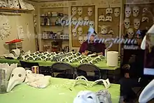 Современные маски раскрашивают от руки, с использованием грунта и сусального золота. Их украшают птичьими перьями и драгоценными камнями.