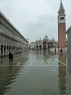Венеция постепенно уходит под воду — с этим фактом столкнулись ещё древние поселенцы, которые были вынуждены дважды перестраивать город, перебираясь на более высокие острова. На протяжении XX века Венеция довольно быстро (до 5 мм в год) погружалась в лагуну, в результате суша погрузилась на 23 см. Основной причиной бедствия выступал промышленный забор воды из артезианских скважин и, как следствие, понижение водоносного слоя земли; на постепенное затопление города также влияет возрастающее давление наземных объектов: зданий и сооружений, людей и т. д. После закрытия скважин оседание города замедлилось, но не прекратилось. В 21 веке первое наводнение в Венеции случилось в 2008 г. По расчётам учёных, Венеция может стать непригодной для жизни уже в 2028 году[10][11], а к 2100 — полностью затонуть[12][13]. Постепенное разрушение (размыв) города происходит также по причине увеличившейся частоты наводнений в Венецианской лагуне (так называемая «высокая вода», итал. acqua alta). Для спасения уникального города был разработан проект MOSE, предусматривающий постройку герметичных барьеров вокруг города. Проект получил одобрение специалистов и был торжественно открыт в 2003 году с закладкой первого камня С. Берлускони. Однако строительство дамб подвергается серьёзной критике из-за низкой эффективности подобной защиты от наводнений, опробованной в Нидерландах, и последствий для окружающей среды (недостаток морской воды может привести к вымиранию множества уникальных и редких видов живых существ, обитающих в акватории лагуны).