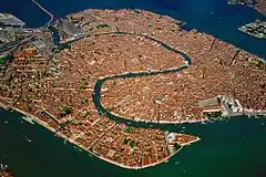 Исторические районы Венеции (сестиеры), сложившиеся в Средние века, расположены вдоль Гранд-канала: Сан-Марко, Каннареджо, Кастелло, Дорсодуро с островами Джудекка и Сакка Физола, Сан-Поло, Санта-Кроче.