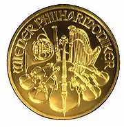 - С 1989 года в честь Венской филармонии выпускаются золотые монеты. Сначала это были монеты в 2000 шиллингов (31,1 г — унция золота), а также 500 шиллингов (7,8 г); позже к ним добавились монеты номиналом в 200 шиллингов (3,1 г — 1/10 унции) и в 1000 шиллингов (15,55 г). В 1992, 1995, 1996 и 2000 годах Всемирная ассоциации золота (World Gold Council) признавала «Венскую филармонию» наиболее продаваемой золотой монетой в мире. С переходом на единую европейскую валюту появились монеты номиналом в 100 евро и, наконец, 1 января 2004 года, одна из самых крупных золотых монет в мире — так называемый Большой Фил, достоинством в 100 000 евро. Дизайн монет остается неизменным с 1989 года[6].