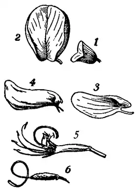 Строение цветка ракитника венечного (Cytisus scoparius): 1 — двугубая чашечка; лепестки: 2 — флаг (парус), 3 — весло (крыло), 4 — лодочка (киль); 5 — тычинки; 6 — завязь с вытянутым столбиком. Фрагмент ботанической иллюстрации из одиннадцатого издания Энциклопедии Британника, 1911 год. |