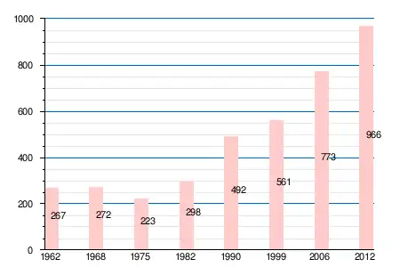 | 1962 | 1968 | 1975 | 1982 | 1990 | 1999 | 2005 | 2006 | 2010 | 2011 | 2012 |