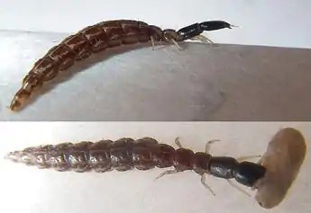 Личинка верблюдки. Личинка, напавшая на кокон муравья. Куколка верблюдки и её сброшенная личиночная шкурка | ||||||||||
