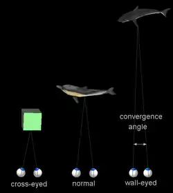 Когда существо с бинокулярным зрением смотрит на объект, глаза должны повернуться вокруг вертикальной оси так, чтобы спроектировать изображения в центр сетчатки каждого глаза. Чтобы посмотреть на близкий объект, глаза поворачиваются навстречу друг другу (конвергенция), в то время как для удаленного объекта они отворачиваются друг от друга (дивергенция). Чрезмерная конвергенция называется перекрёстным взором (с фокусом на носу, например). Если смотреть на расстоянии, глаза расходятся до параллели, эффективно фиксируют точку в бесконечности (или очень удалённую).