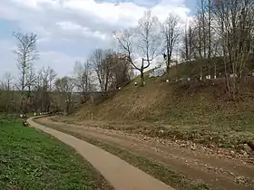 - Земляной вал — имеет высоту 6 метров. Насыпан в XIV веке.