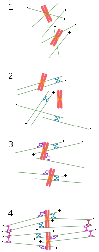 4. Минус-концы микротрубочек скрепляются между собой и образуют полюса деления при участии динеина и кинезина-14.Сборка веретена зависит от двух ключевых процессов. Во-первых, от формирования биполярного скопления микротрубочек вокруг хромосом. Во-вторых, от прикрепления хромосом к микротрубочкам от противоположных полюсов деления[6]. Присоединение сестринских хроматид к микротрубочкам является неотъемлемой частью процесса сборки веретена. Однако, хромосомы и многие моторные и другие белки, участвующие в формировании полноценного веретена деления изолированы внутри клеточного ядра. А микротрубочки и центросомы (у животных) находятся в цитоплазме. Таким образом, сборка веретена зависит от разрушения ядерной оболочки в прометафазе[7].