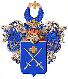 Щит украшен дворянскими шлемом и короной. Нашлемник: две руки в лазоревом одеянии, держащие золотой крест. Намёт лазоревый с серебром.