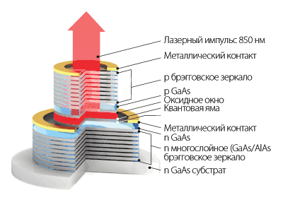 Современные варианты конструкции вертикально-излучающих лазеров (VCSEL) основаны на использовании вертикальных оптических микрорезонаторов с зеркалами на основе чередующихся слоев полупроводниковых материалов различного состава (например, твердых растворов AlGaAs c различным содержанием Al). При этом в качестве активной (светоизлучающей) области, как правило, используются одна или несколько квантовых ям.
