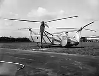 Трёхвинтовой вертолёт — вертолёт, имеющий три несущих винта, расположенных в плане в виде треугольника. Реактивный момент несущих винтов в случае их однонаправленного вращения компенсируется за счёт наклона осей вращения винтов[8].