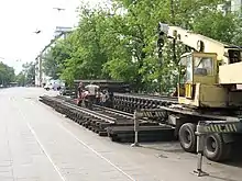 Рельсошпальная решётка собранная на путевой базе и привезёная к месту замены трамвайного пути