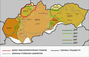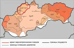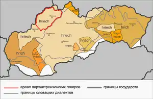 Верхнетре́нчинские го́воры (также верхнетренчинский диалект, севернотренчинские говоры, севернотренчинский диалект; словацк. hornotrenčianske nárečia, severotrenčianske nárečia) — говоры западнословацкого диалекта, распространённые в северо-восточной части Тренчинского края и в северо-западной части Жилинского края Словакии[3][4][5]. Согласно классификации словацких диалектов, опубликованной в «Атласе словацкого языка», вернетренчинские говоры вместе с нижнетренчинскими и поважскими входят в группу северных западнословацких говоров[6]. Верхнетренчинский диалектный ареал делится на собственно верхнетренчинские, кисуцкие (нижнекисуцкие) и верхнекисуцкие говоры[7][8]. В некоторых классификациях кисуцкие говоры не включают в состав верхнетренчинского ареала и выделяют как самостоятельный диалектный ареал[9][10].