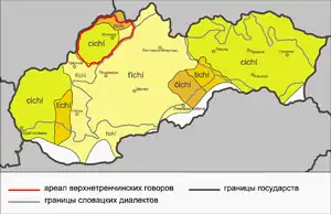 С востока к ареалу верхнетренчинских говоров примыкает ареал говоров среднесловацкого диалекта: с северо-востока — область распространения оравских говоров, с востока — турчанских говоров, с юго-востока — верхненитранских говоров. На юге верхнетренчинские говоры граничат с северными западнословацкими нижнетренчинскими говорами[3][9][10]. На западе к ареалу верхнетренчинских говоров примыкает область распространения северного (валашского) диалекта восточноморавской (моравско-словацкой) диалектной группы[~ 2][29][30], на северо-западе — область распространения южного (моравского) диалекта и восточного (остравского) диалекта (включая верхнеостравицкие говоры) североморавской (силезской, ляшской) диалектной группы, а также ареалы яблонковских и чадецких говоров силезского диалекта польского языка (или же польско-чешских говоров)[31][32]. С севера верхнетренчинский ареал граничит с так называемыми говорами польских гуралей — живецкими говорами малопольского диалекта[33].