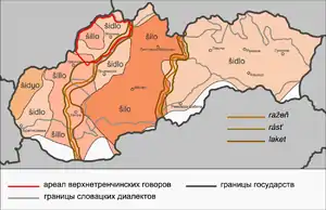 - Распространение окончаний с дифтонгом i̯a у одушевлённых существительных в форме именительного падежа множественного числа, характерных для среднесловацкого диалекта: ľuʒi̯a (литер. ľudia «люди»), braci̯a (литер. bratia «братья»), sinovi̯a (литер. synovia «сыновья»), zacovi̯a (литер. zaťovia «зятья»). В западнословацком ареале в данных формах преобладают окончания с гласным порядка e: luďi̯e / ludé / ludi̯é, sinovi̯e / sinové / sinovi̯é и т. п.[112][113] Небольшой ареал с распространением дифтонга i̯a во флексиях указанных форм размещён на северо-западе Поважья[96]. Формы одушевлённых существительных типа luďá, sinová распространены в средненитранских говорах[97].