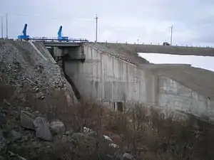 - правобережная дамба длиной 550 м и наибольшей высотой 15 м;