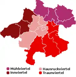 Территория земли разделена на 4 крупных района: Хаусрукфиртель, Иннфиртель, Мюльфиртель и Траунфиртель. Верхняя Австрия состоит из трёх штатутарштадтов (Линц, Вельс и Штайр) и 15 округов: