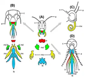 Строение верхней губы (обозначена красным) у различных насекомых. (A) короткоусые прямокрылые, (B) медоносные пчёлы, (C) булавоусые чешуекрылые (D) комары.