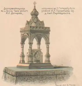Сей престол сооружен усердием С.-Петербургских купцов В. Л. Фролова и А. И. Тименкова ноября 30-го дня 1861 года 84 пробы, серебра 7 пудов 6 фунтов 9 золотников, работал мастер Ф. А. Верховцев. Цена сего облачения, деланного мастером Верховцевым, с работой по 88 рублей за фунт, с украшениями креста и с футляром 26,036 рублей 20 копеек.