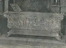 - В ногах — обретение мощей святителя[63]. На рельефе изображена внутренность каменной пещеры с открытым гробом, который окружают молящие, монашествующие, духовенство.