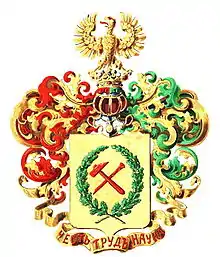 Щит увенчан дворянским коронованным шлемом. Нашлемник: золотой орел с червлеными глазами и языком. Намет: справа — червлёный, слева зелёный, подложенный золотом. Девиз: «ЧЕСТЬ, ТРУД, НАУКА» червлёными буквами на золотой ленте.