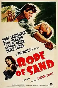 «Верёвка из песка» (англ. Rope of Sand) — американский приключенческий фильм 1949 года, снятый режиссёром Уильямом Дитерле и спродюсированный Хэлом Уоллисом. Уолтер Дониджер получил номинацию на премию «Золотой глобус» за сценарий к фильму. Изначально он писался в расчёте на то, что главные роли исполнят звёзды «Касабланки» Хамфри Богарт и Ингрид Бергман, однако их экранное воссоединение не состоялось, зато из актёрского состава «Касабланки» в новом фильме были задействованы Пол Хенрейд, Клод Рейнс и Петер Лорре. Берт Ланкастер, утверждённый на главную роль вместо Богарта, в процессе съёмок часто спорил с Дониджером относительно сценария, а после выхода фильма назвал его самым неприятным в своей карьере. Главную женскую роль исполнила французская актриса Коринн Кальве, для которой этот фильм стал дебютом в Голливуде[1].