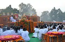 Около полудня у Сваямбу, Боудхи и других ступах Непала на паланкин, уставленный цветами и огнями, помещают статую Будды. К паланкину присоединяется огромная процессия монахов и мирян, которые читают молитвы, бьют в барабаны, несут буддийские флаги и картины с изображением Будды. Процессия движется по улицам города, а буддийские семьи выстраиваются вдоль дороги поднося на паланкин цветы, благовония, фрукты и деньги. Дома каждая буддийская семья также готовит специальный алтарь со статуей или изображением Будды и различными подношениями[54].