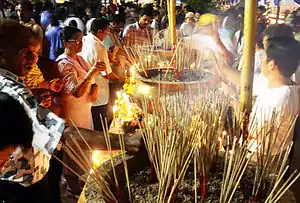 В некоторых храмах перед алтарём выставляют статую Будды в маленькой чаше, украшенной цветами и наполненной водой или сладким чаем. Прихожане зачёрпывают воду или чай и поливают статую, совершая ритуальное Омовение Будды. Это символ очищения от плохой кармы практикующего, который воспроизводит события, последовавшие за рождением Будды, когда дэвы и духи делали ему небесные подношения[15].