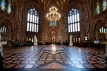 Это восьмиугольное помещение прямо под Центральной башней. Здесь сходятся коридоры, ведущие в кулуары Палаты лордов и Палаты общин, через западные двери выходит в холл св. Стефана и общественный вход в дворец, а через восточные — в нижний зал ожидания и библиотеку. Диаметр холла составляет 18 метров, а высота до центра сводчатого потолка — 25 метров. Над каждой из четырёх дверей холла имеется мозаика, изображающая святых покровителей наций, составляющих Соединённое Королевство: св. Георгия для Англии, св. Андрея для Шотландии, св. Давида для Уэльса и св. Патрика для Северной Ирландии.